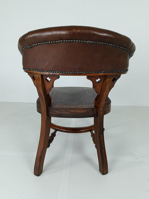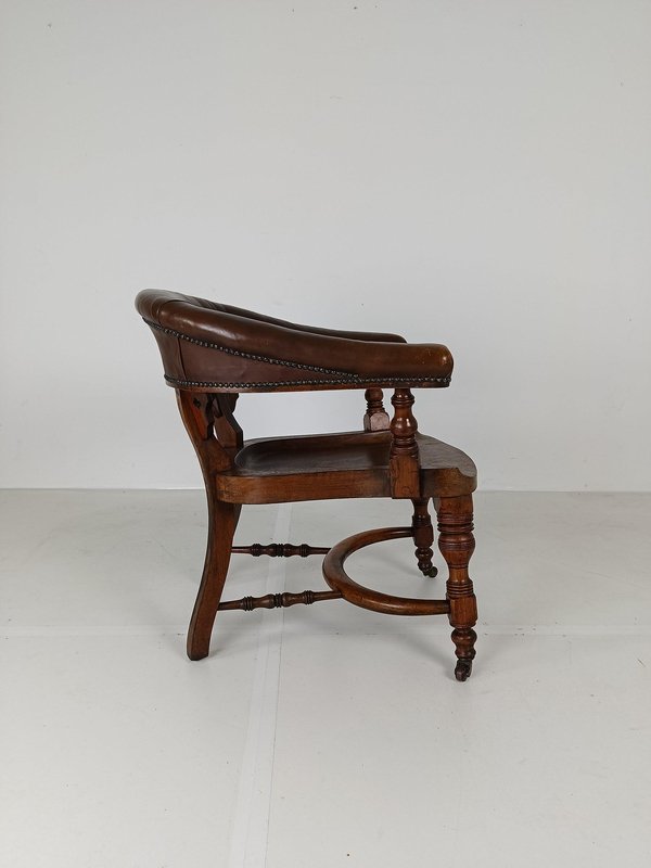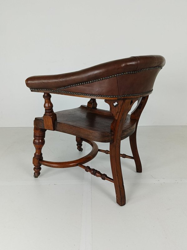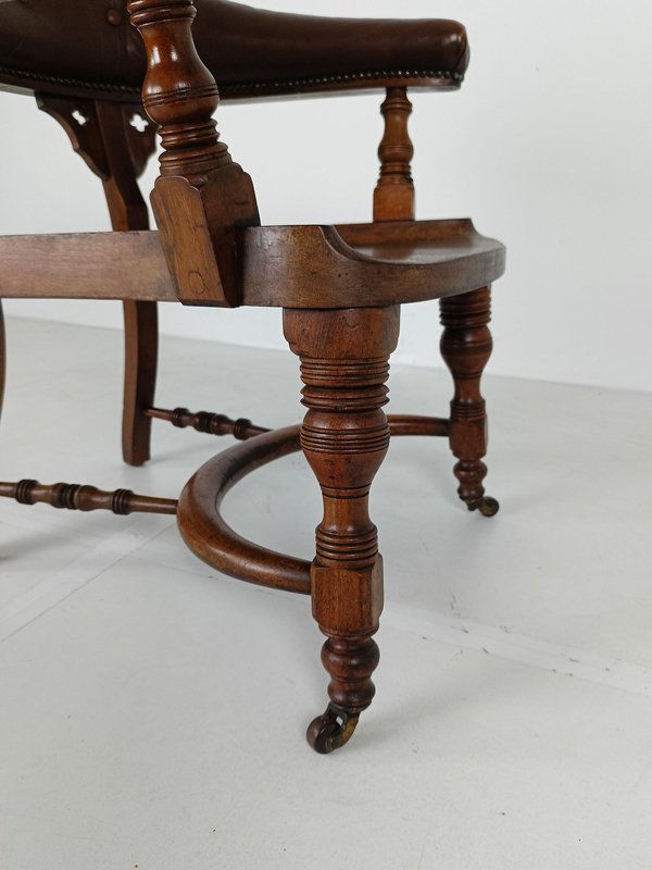 A fine 19th-century English Victorian saddle-seat desk chair, crafted from solid mahogany, dating to circa 1880. The chair features a curved, deep-buttoned upholstered backrest and wraparound arms, adorned with hand-tacked brass studs. The backrest and arms are supported by shaped back supports and turned arm supports. The chair rests on elegantly turned front legs and back-splayed cabriole legs, all connected by a curved stretcher, and retains its original solid porcelain castors. The brown upholstered seat provides exceptional comfort, with a seat height of 42 cm. Measurements Height 78cm Width 69cm Depth 75cm Seating H 42cm/W 52cm/D 52cm