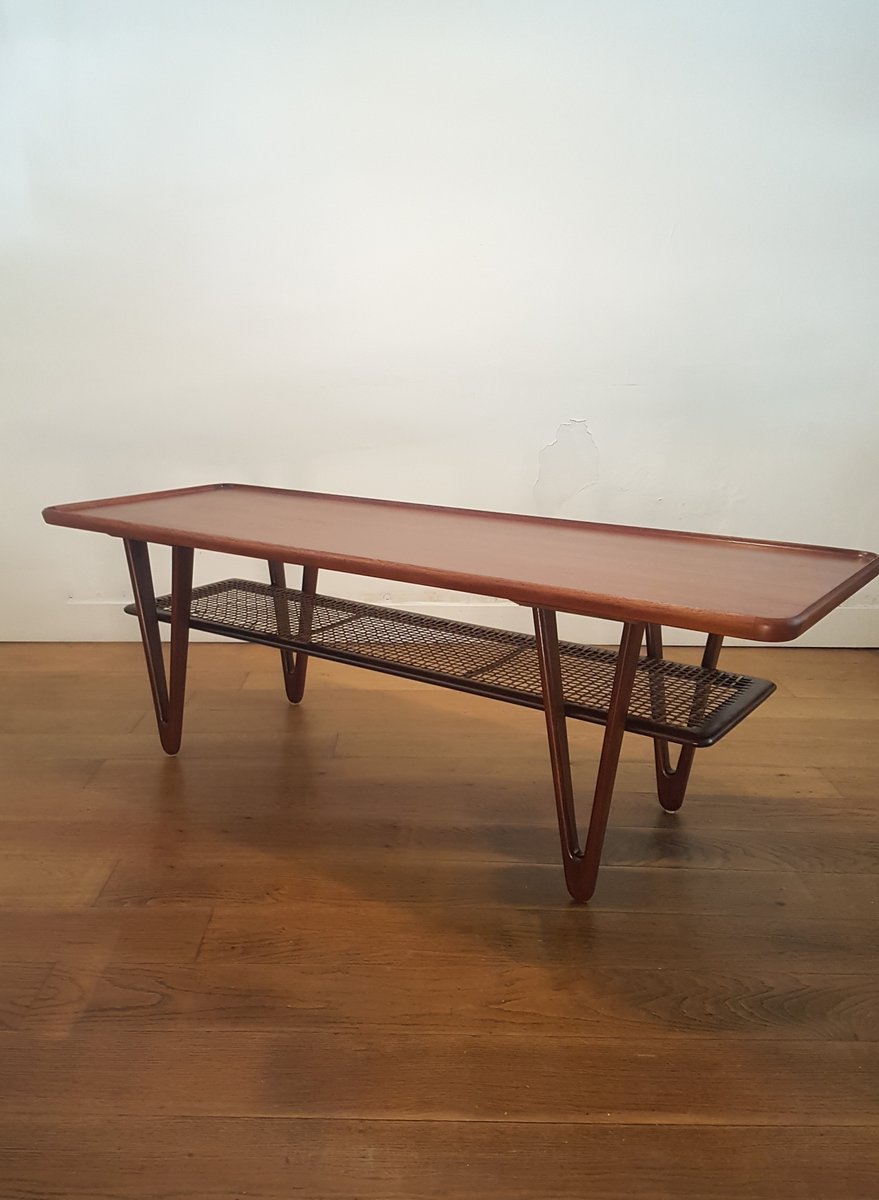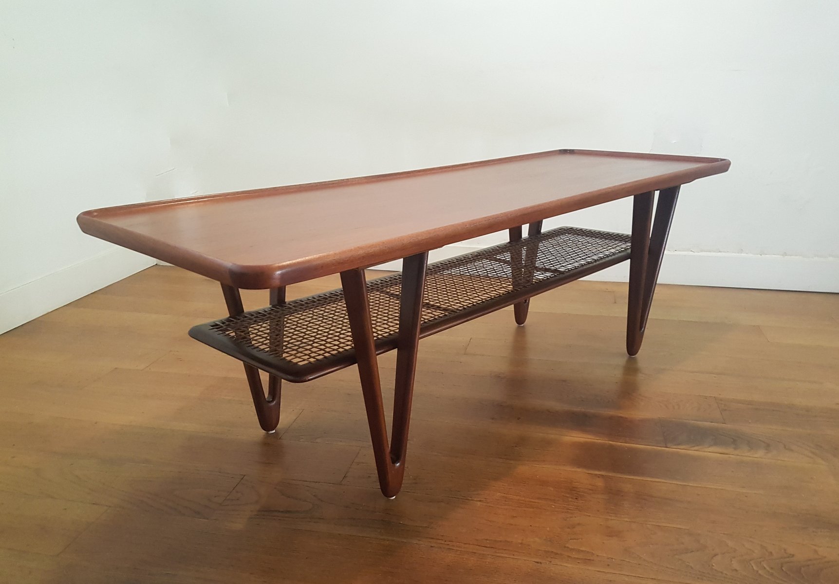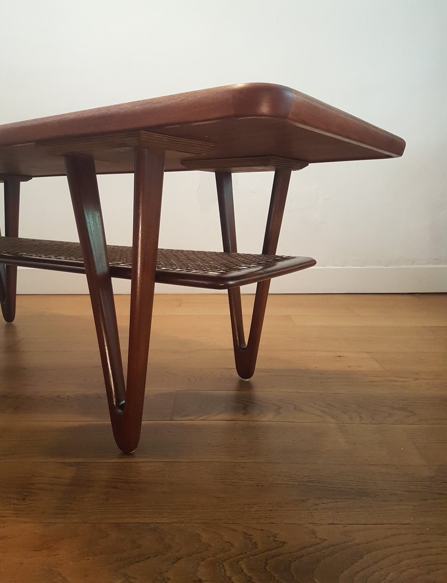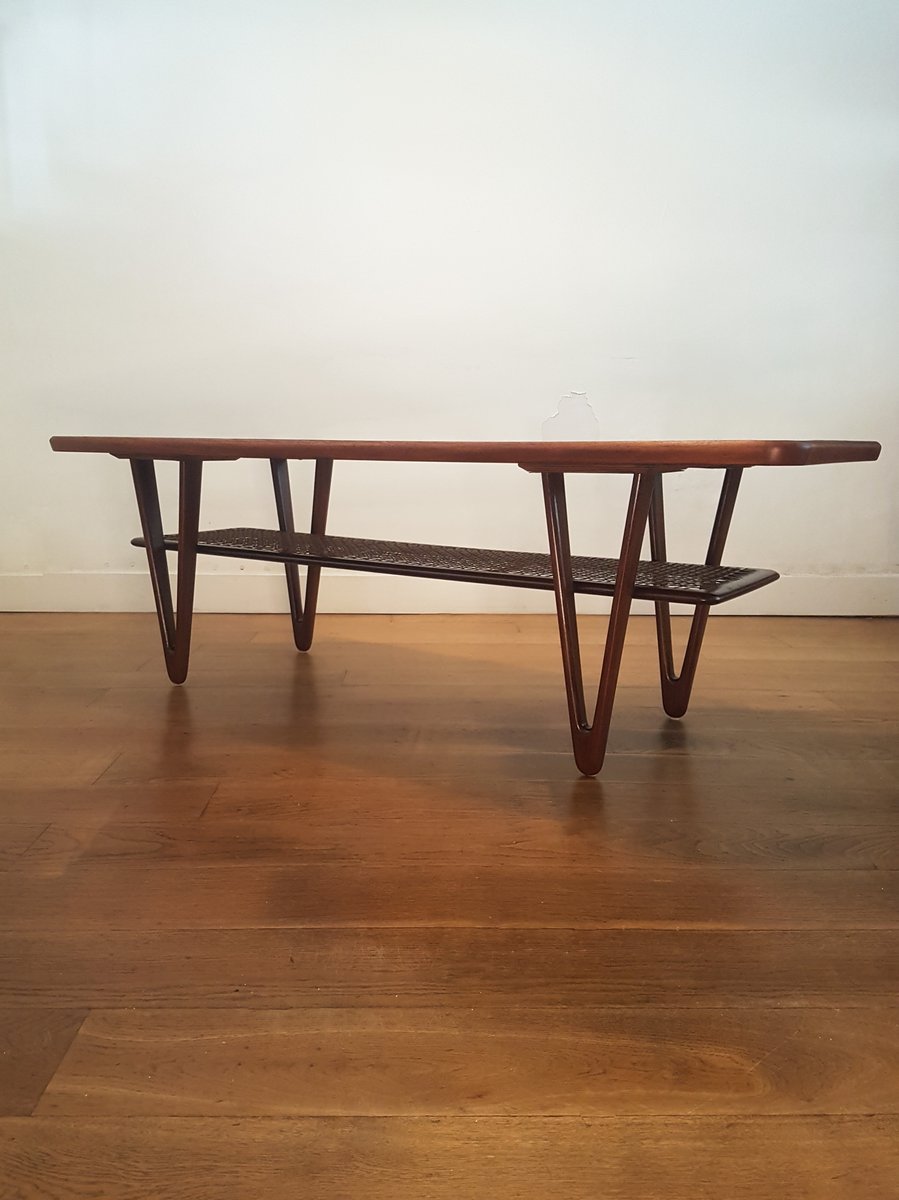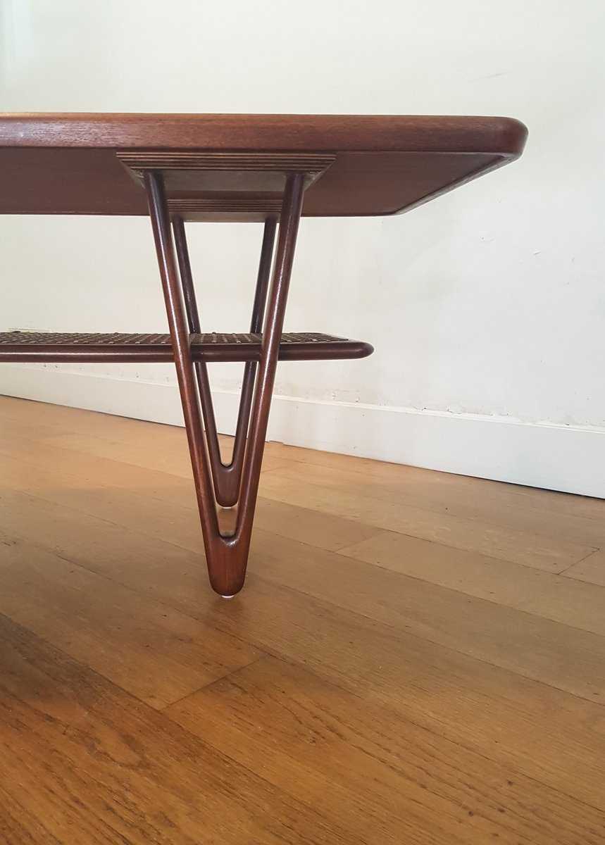 Vintage Couchtisch aus Teak & Rohrgeflecht mit V-förmigen Beinen, Kurt Østervig zugeschrieben, Dänemark, 1950er