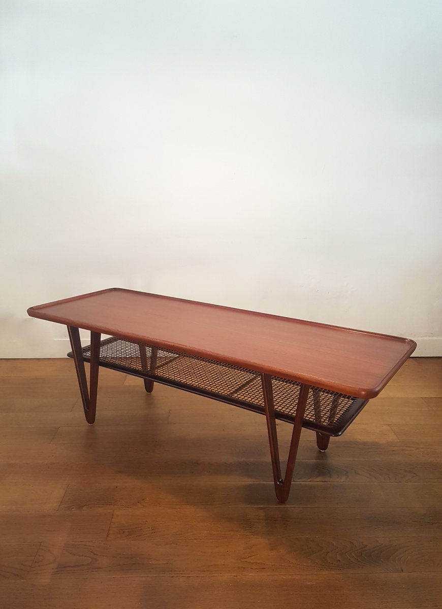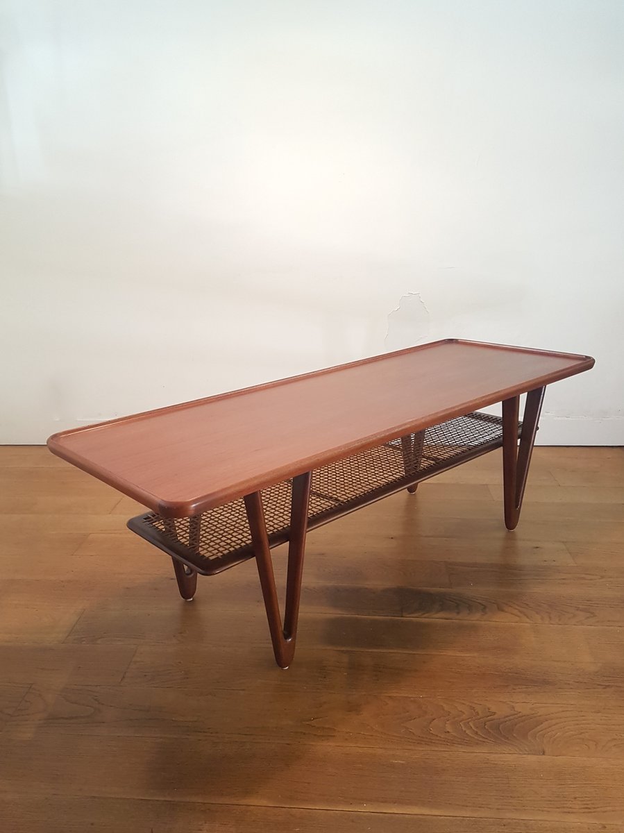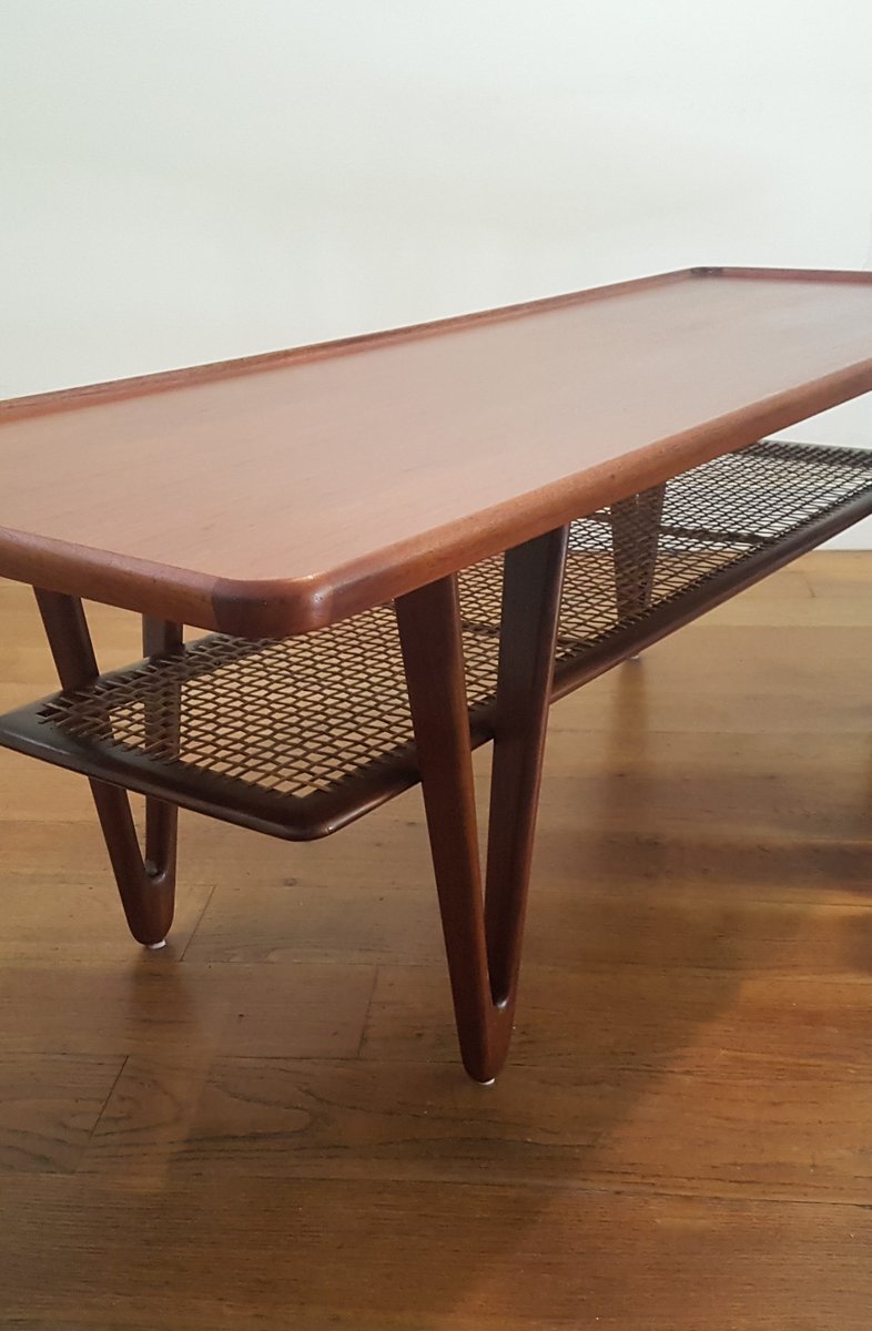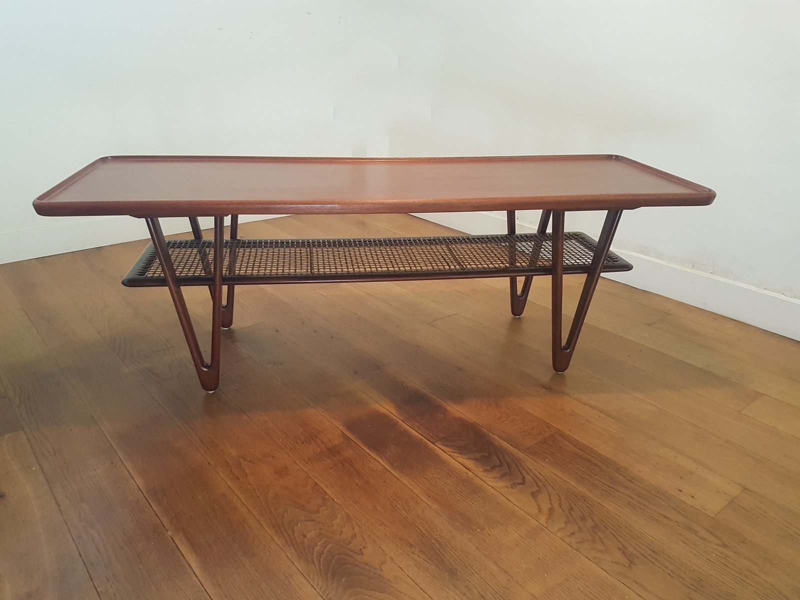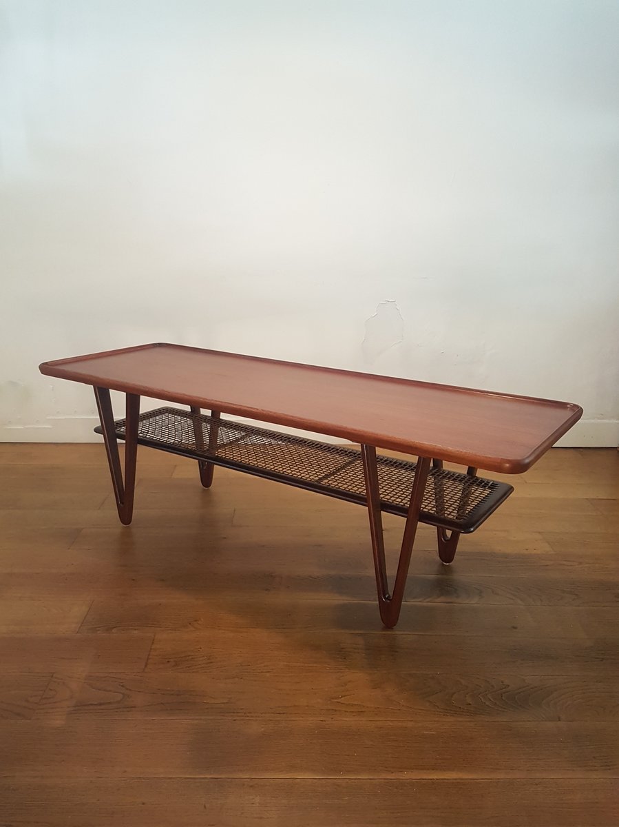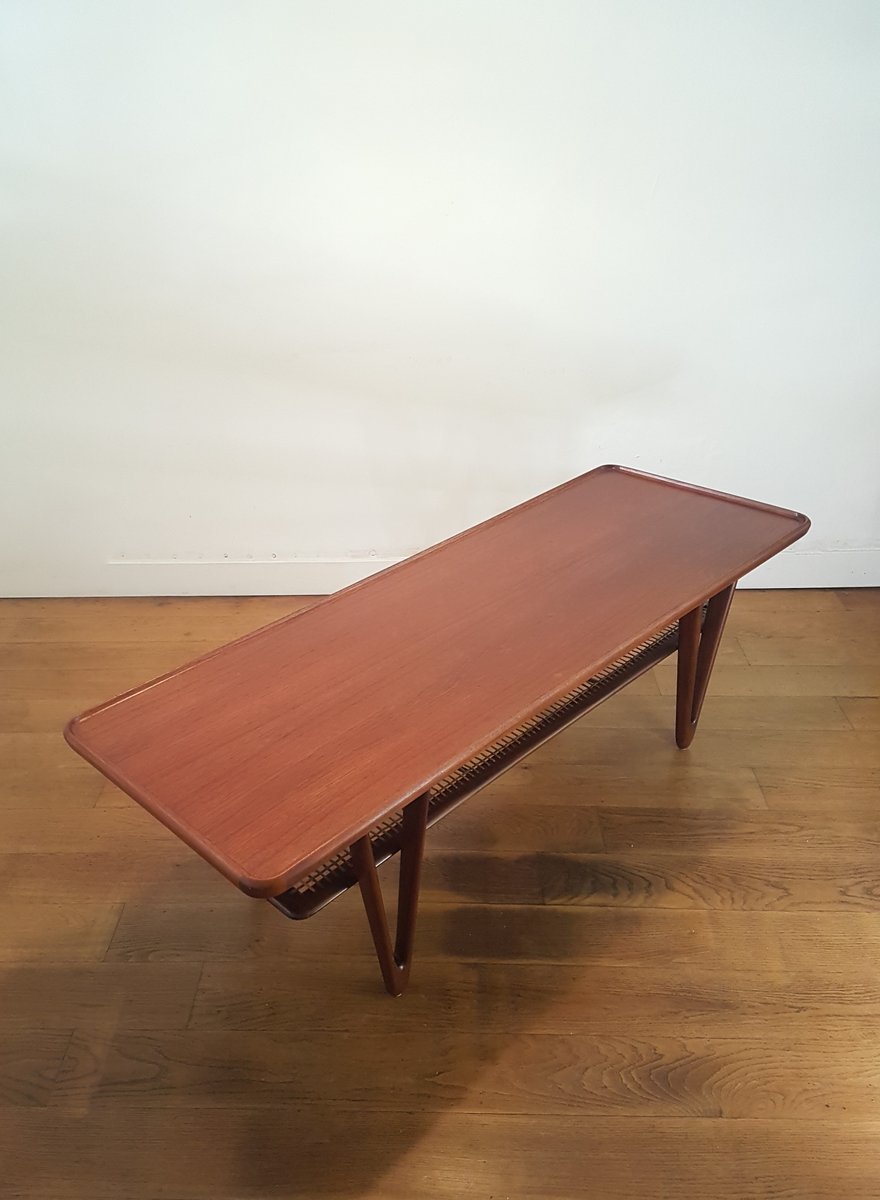 Vintage Couchtisch aus Teak & Rohrgeflecht mit V-förmigen Beinen, Kurt Østervig zugeschrieben, Dänemark, 1950er