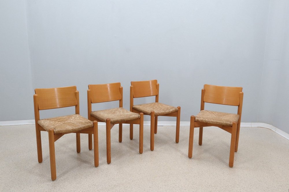 Vintage Esszimmerstühle aus Holz mit Sitz aus Stroh, 1970er, 4er Set