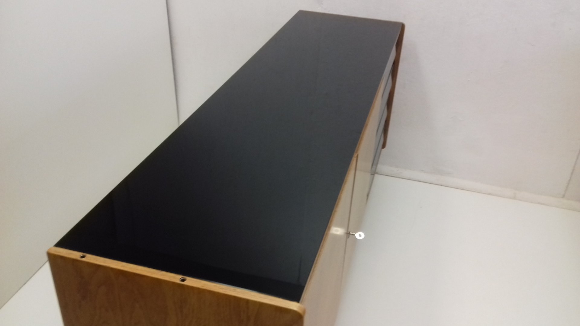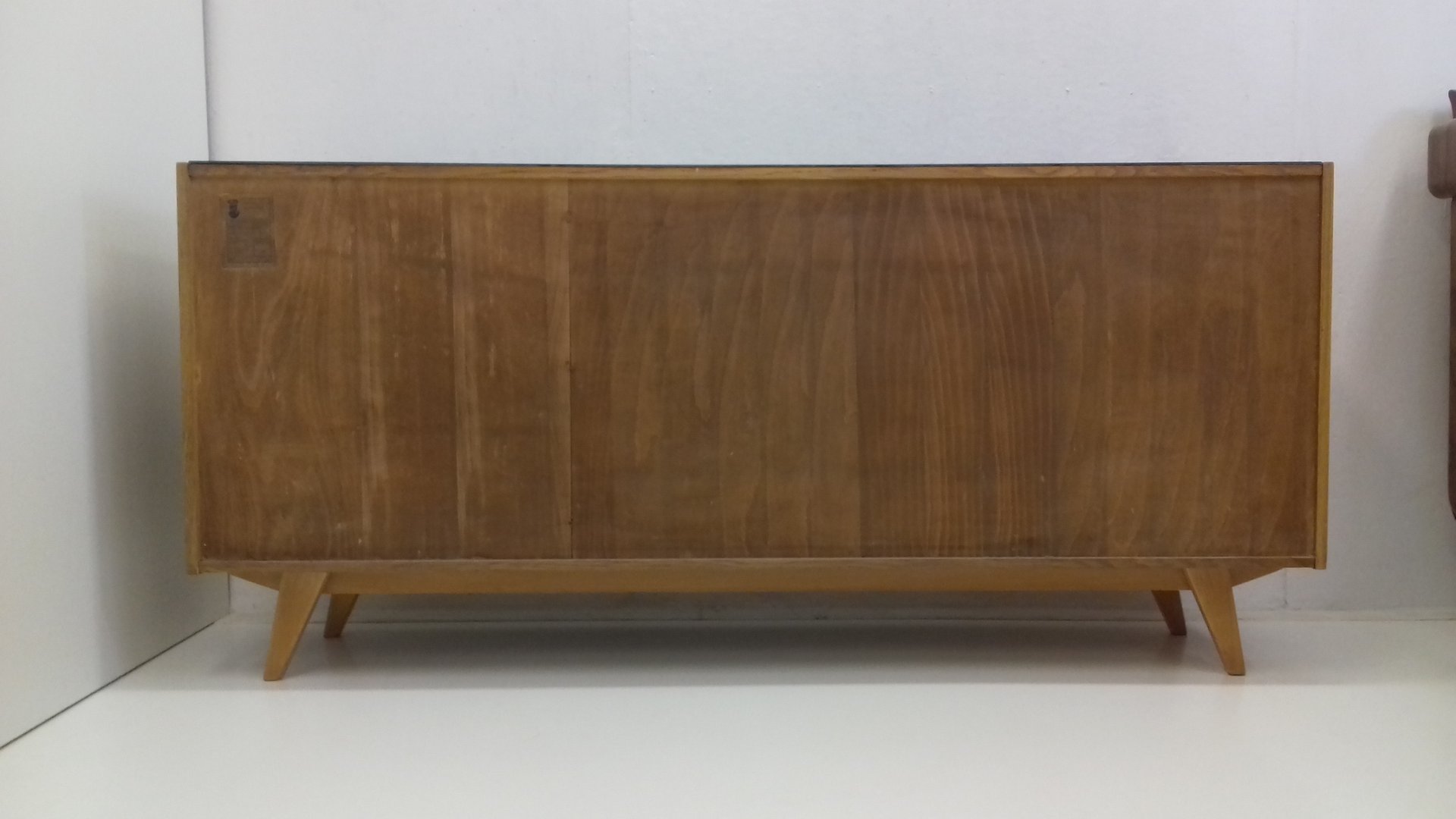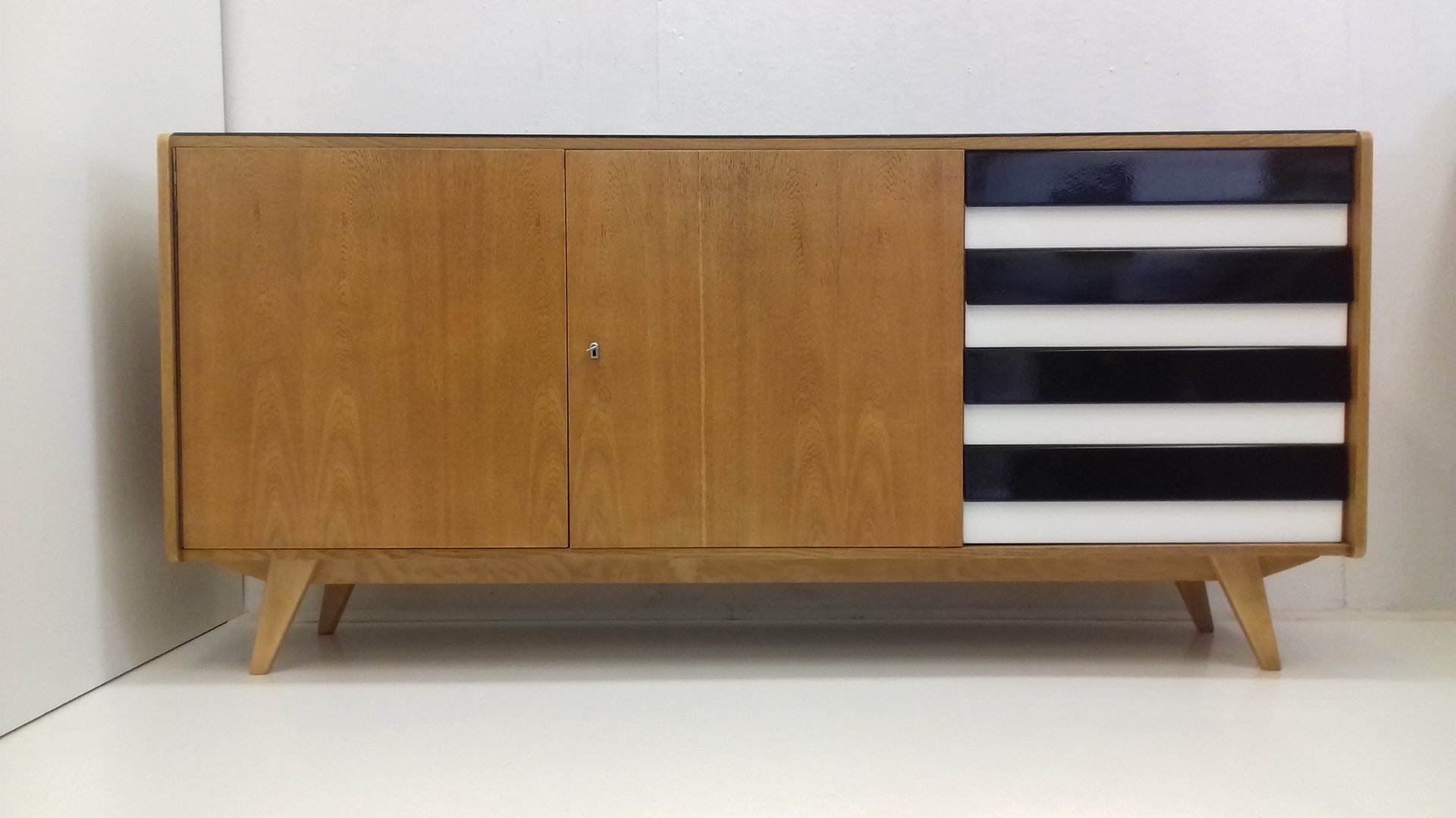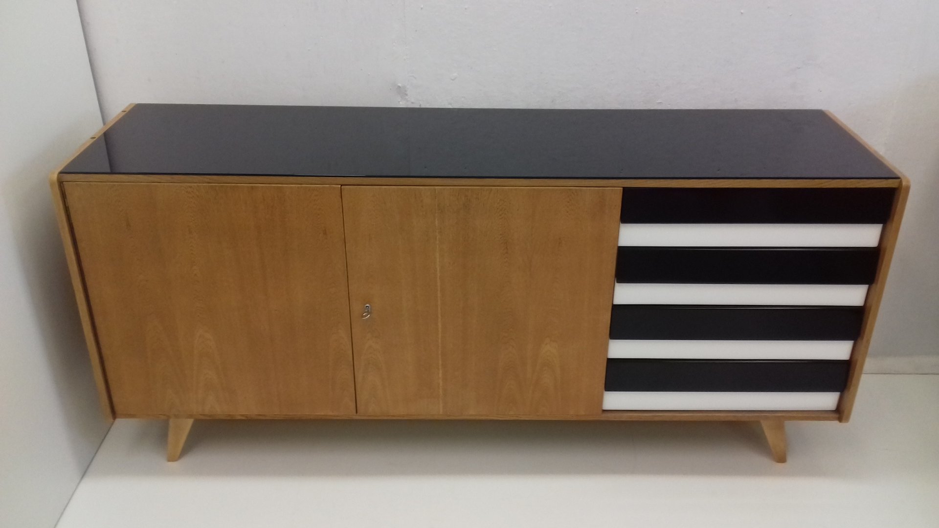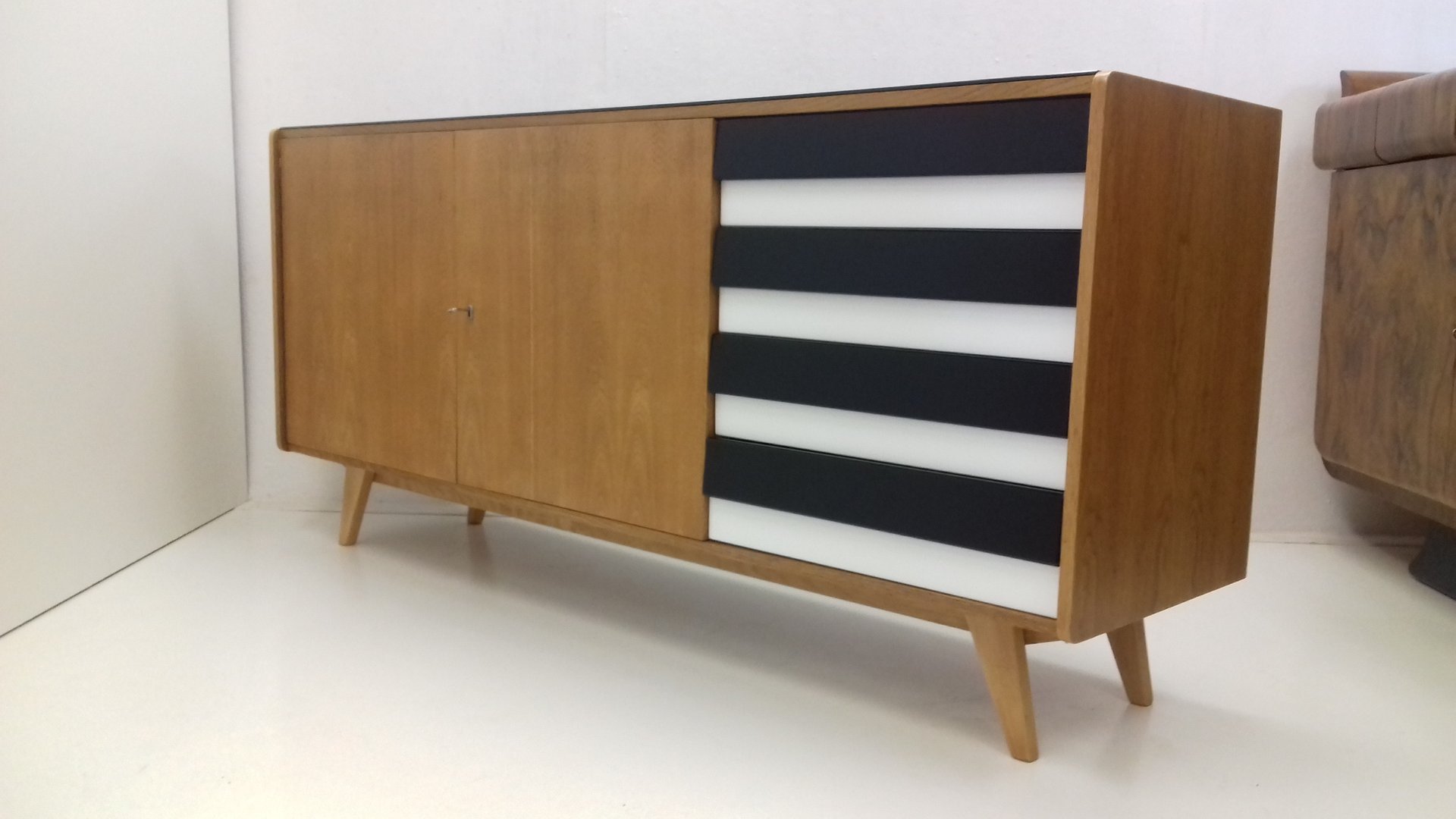 On the heels of early successes, Jiroutek became the head of design at Interier Praha in 1958 and soon after began work on the U-450 series. The designs were heavily inspired by the watershed ’58 Expo in Brussels, which moved Czech postwar design generally toward a “softer” modernism—one characterized by pastel colors, new geometries, and the use of modern materials like engineered composites, glass, and concrete. Jiroutek became know especially for the simple morphologies of oak-veneered sideboards and cabinets with sleekly color-blocked sliding doors and drawers.