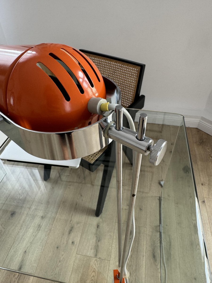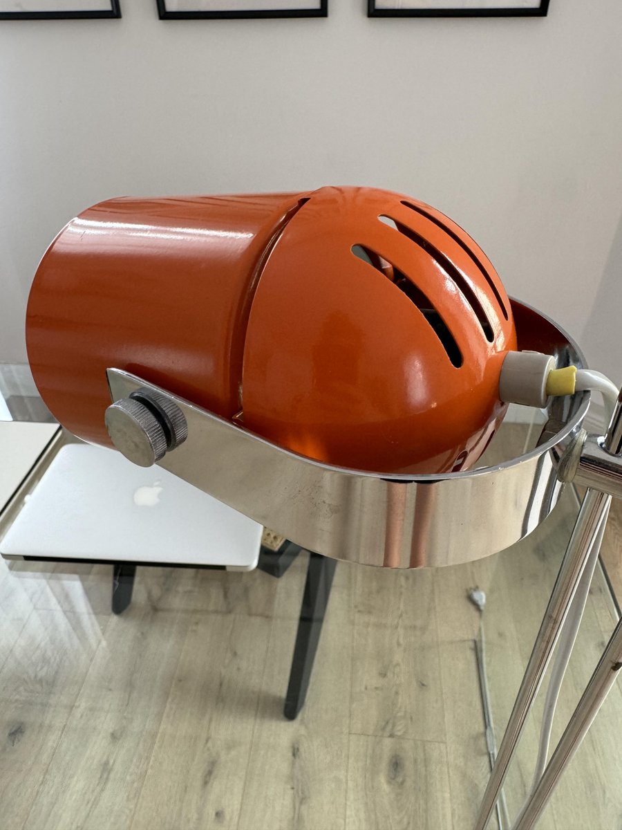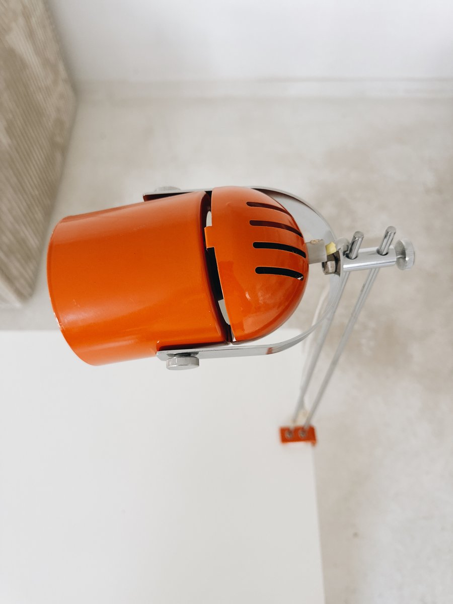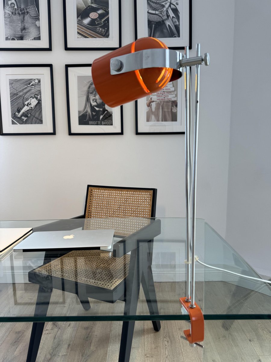 This original 1970s Space Age desk lamp is a striking example of mid-century modern design. Featuring a bold orange metal shade with chrome accents, this piece embodies the futuristic aesthetics of the era. The lamp is fully adjustable, allowing for directional lighting, and is mounted on a sleek metal frame with a clamp base, making it a perfect space-saving solution for desks or shelves.