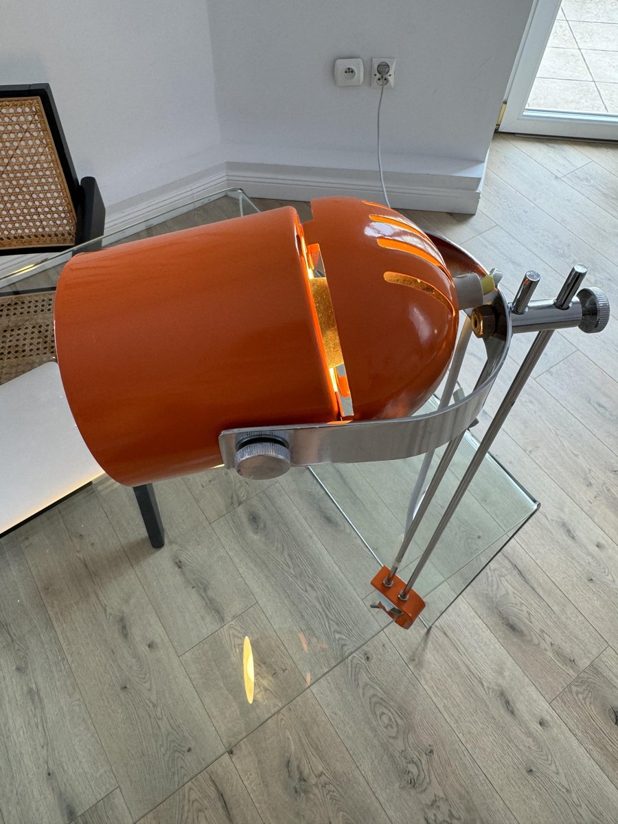 Diese originale Space Age-Schreibtischlampe aus den 1970er Jahren ist ein beeindruckendes Beispiel für modernes Design aus der Mitte des Jahrhunderts. Mit ihrem kühnen orangefarbenen Metallschirm mit Chromakzenten verkörpert sie die futuristische Ästhetik der Epoche. Die Lampe ist vollständig verstellbar und ermöglicht eine gerichtete Beleuchtung. Sie ist auf einem schlanken Metallrahmen mit Klemmsockel montiert und eignet sich daher perfekt als platzsparende Lösung für Schreibtische oder Regale.