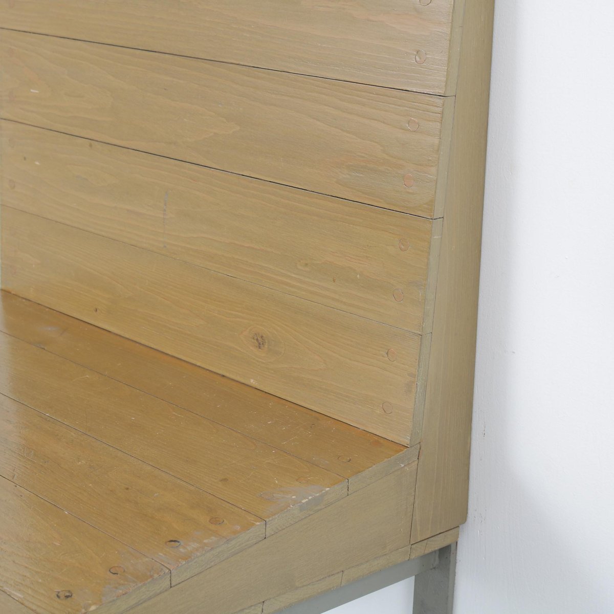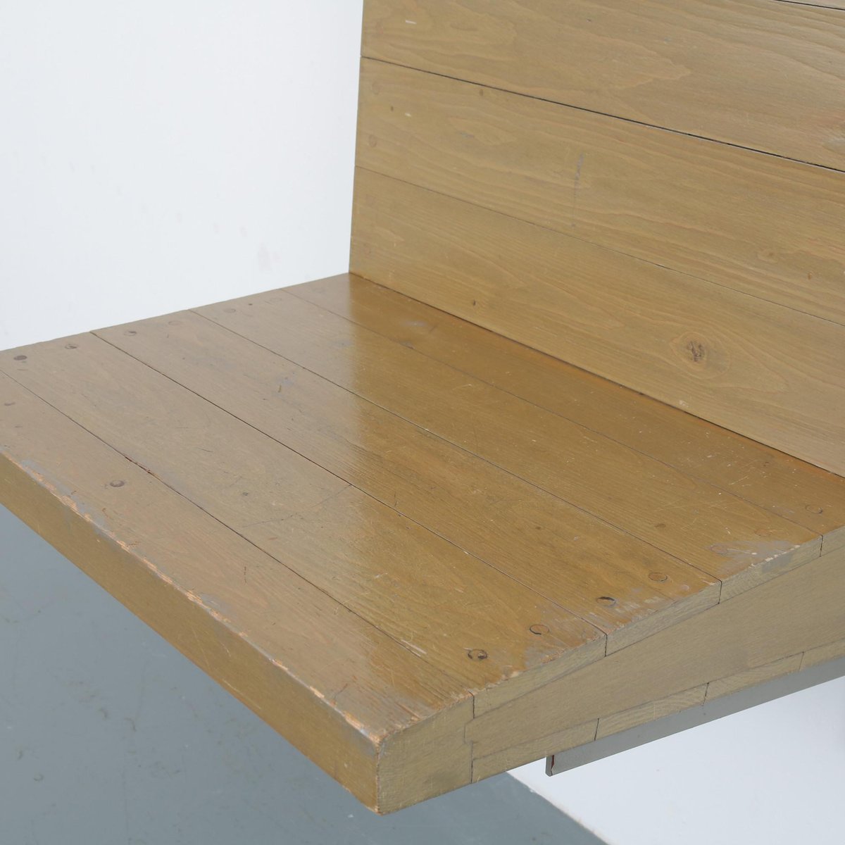 Dieser ikonische, an der Wand befestigte Sitz wurde in den 1970er Jahren von Dom Hans van der Laan in den Niederlanden entworfen. Sein auffälliges, minimalistisches Design hat einen hohen Wiedererkennungswert und ist eines der schönsten Beispiele für niederländisches Design aus der Mitte des Jahrhunderts. Der Sitz ist aus Holz gefertigt, hat eine Metallstruktur und Kupfernägel. Dieser Qualitätssitz ist ein echtes Stück (niederländischer) Designgeschichte! Er stammt aus einer Arztpraxis in der niederländischen Stadt Sint-Michielsgestel. Das Gebäude wurde im Stil der Bosschen Schule vom Architekturbüro Vermeulen in Veldhoven, Niederlande, entworfen. Wir verfügen über die Originalzeichnungen des Architekten sowie über Fotos der Praxis. Er befindet sich in einem guten Originalzustand mit geringen alters- und gebrauchsbedingten Abnutzungserscheinungen, die eine schöne Patina erhalten haben. Dom Hans van der Laan, Erfinder, Architekt, Designer. Der Benediktinermönch und Architekt Hans van der Laan (1904-1991) hat zwar nur ein kleines Werk geschaffen, doch sein Vermächtnis ist in der Welt der Architektur hoch angesehen. Obwohl er drei Klöster und ein Privathaus entwarf, vollendete er erst im Alter von 53 Jahren seinen ersten richtigen Entwurf, die Abtei St. Benedictusberg in Vaals, von der diese Bank stammt. Das Gebäude wurde sofort als sein Meisterwerk gefeiert. Den größten Teil seines Lebens widmete Van der Laan jedoch der Konzeption von Form, Proportion und der Art und Weise, wie der Mensch architektonische Räume wahrnimmt. Er entwickelte auch die Theorie der plastischen Zahlen.