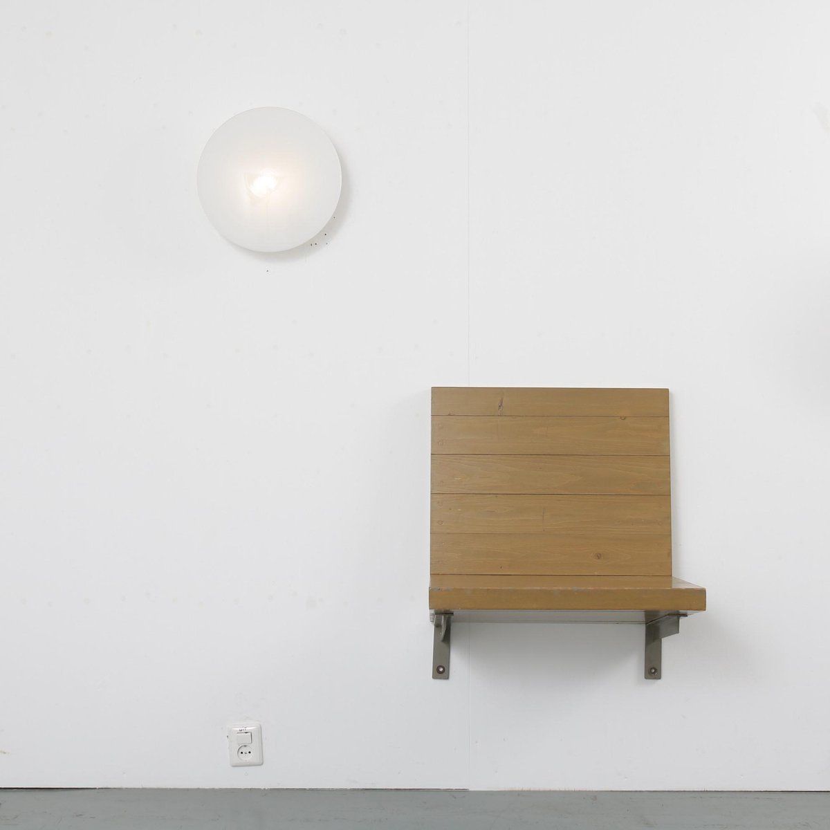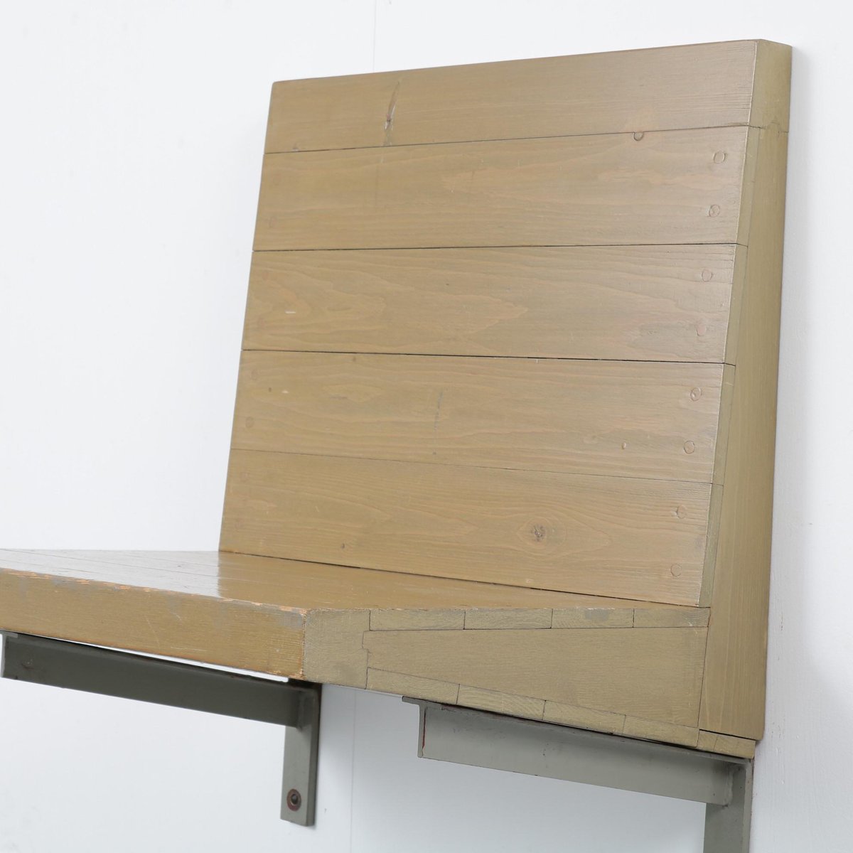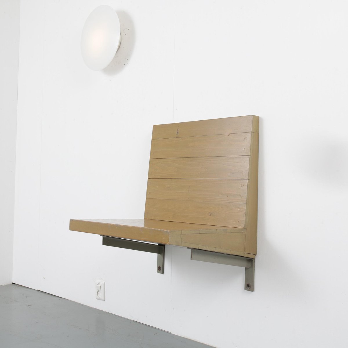 This iconic, wall mounted seat was designed by Dom Hans van der Laan in the Netherlands in the 1970s. It’s eye-catching, minimalist design is highly recognizable and one of the most beautiful examples of mid-century Dutch design. The seat is made of wood, it has a metal structure and copper nails. This quality seat is a true piece of (Dutch) design history! It comes from a doctor’s practice in the Dutch town Sint-Michielsgestel. The building was designed in the Bossche School style by Vermeulen architect’s office in Veldhoven, the Netherlands. We have the original architect’s drawings available, as well as photos of the practice. It remains in good original condition, with minor wear consistent with age and use, preserving a beautiful patina. Dom Hans van der Laan, originator, architect, designer. Benedictine monk and architect Hans van der Laan (1904-1991) may have had a small body of work, but his legacy is highly regarded in the world of architecture. Although he designed three monasteries and a private dwelling, it was not until he reached the age of 53 that he completed his first real design, the St Benedictusberg Abbey in Vaals of which this bench is from. The building was immediately acclaimed as his masterpiece. The greatest part of Van der Laan’s life, however, was dedicated to conceptualizing form, proportion and the way in which human beings perceive architectural spaces. He also developed the theory of plastic numbers.