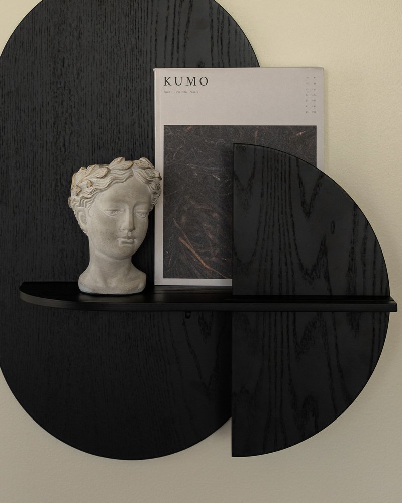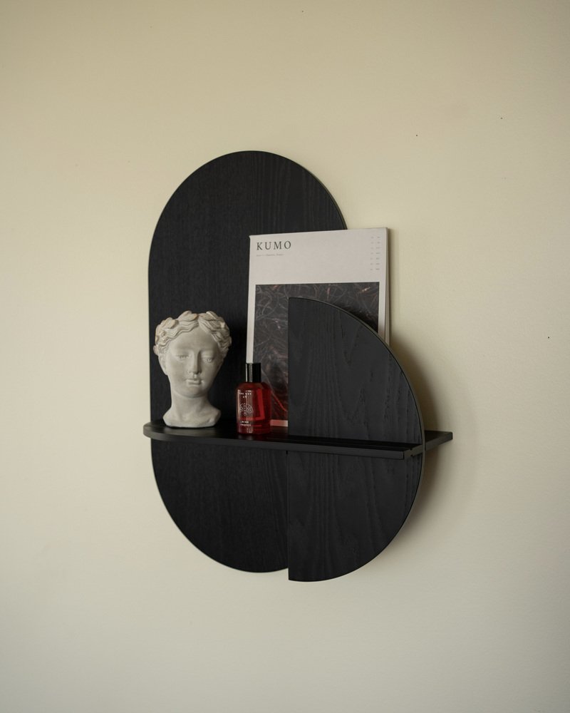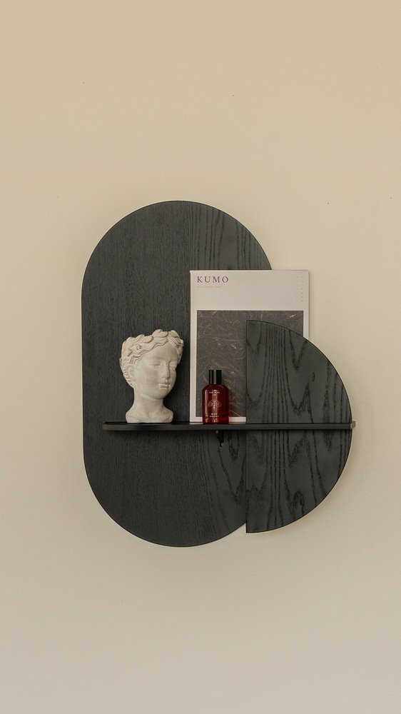 Composed of 3 flat pieces of Plywood and a metal bracket that is fixed on the wall. The arrangement of these pieces gives the product the ability to hide objects behind the vertical pieces, since there is a separation between them. In the shelf version (M), we have a small space behind the front piece (sun or moon) to hide small objects such as keys, a wallet, a smartphone, etc.