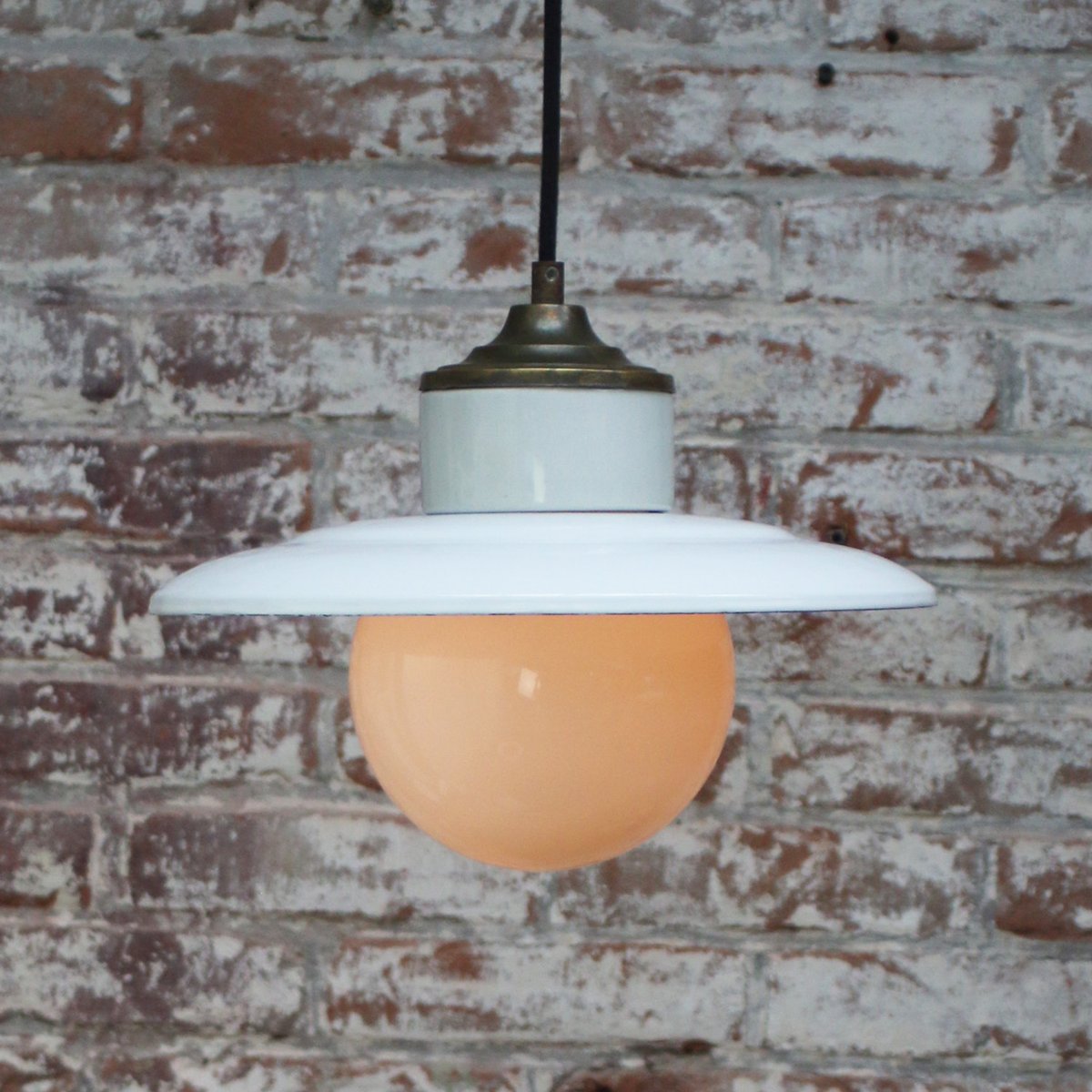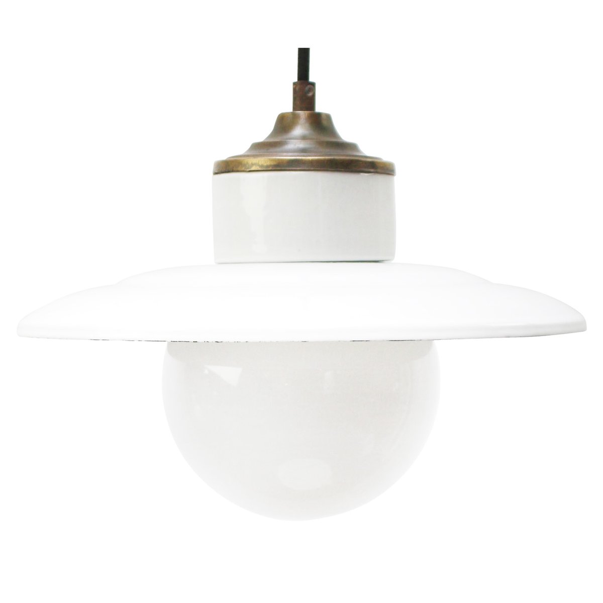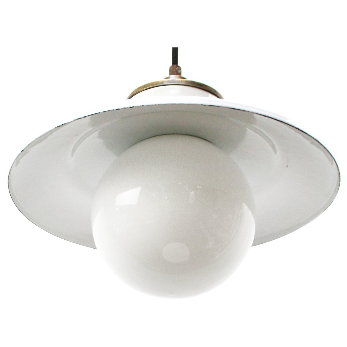 Weiße Vintage Hängelampe aus Emaille, Opalglas, Porzellan & Messing