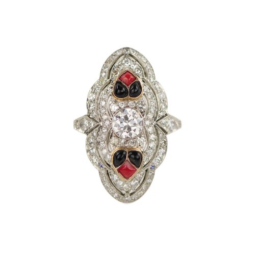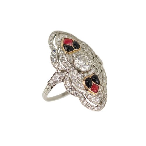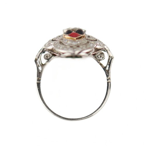 Weißgold Ring mit Diamanten und Emaille im Art Deco Stil. 20. Jahrhundert.