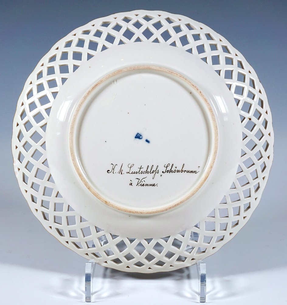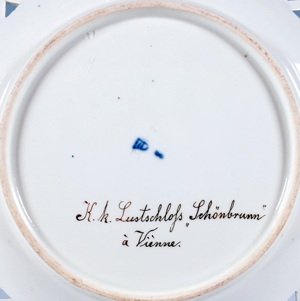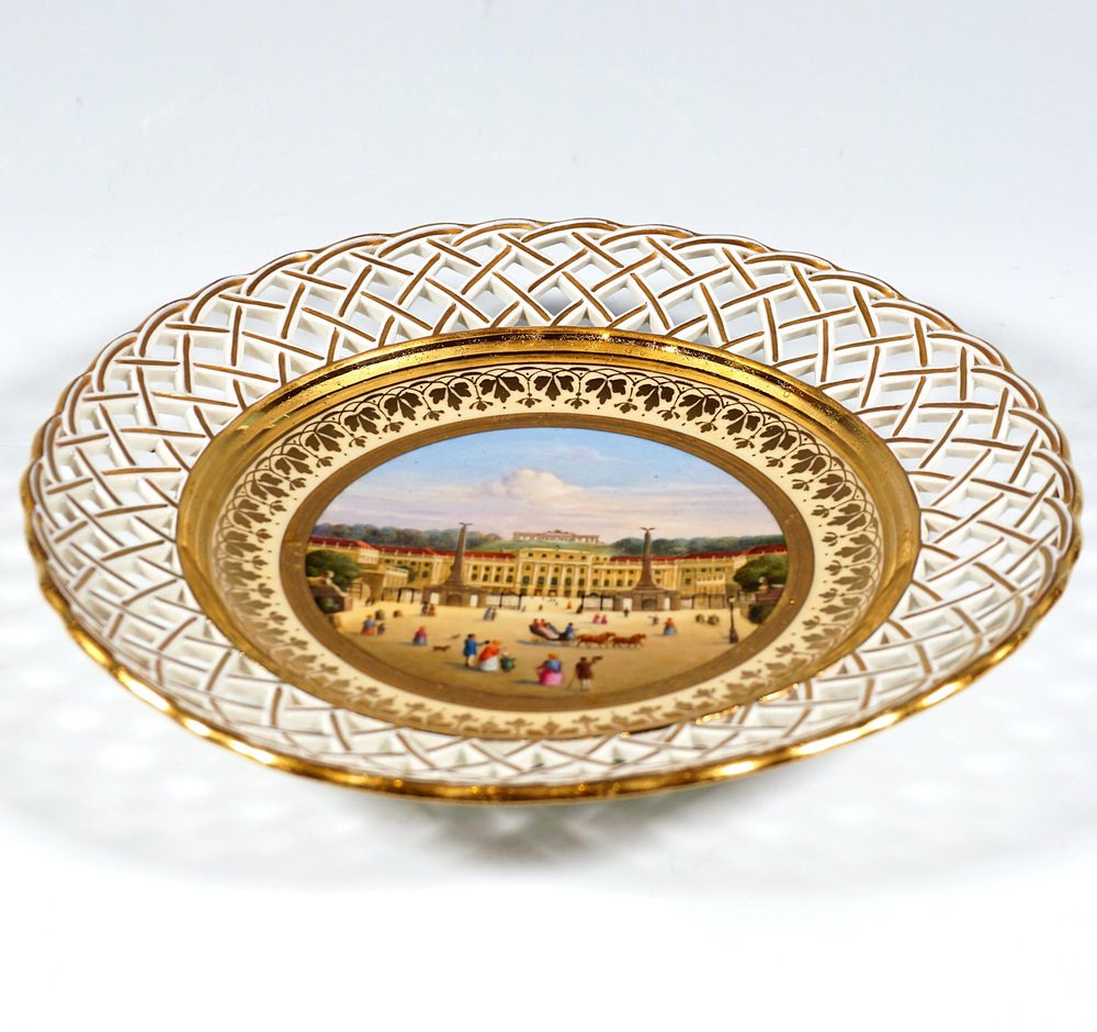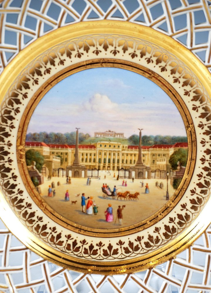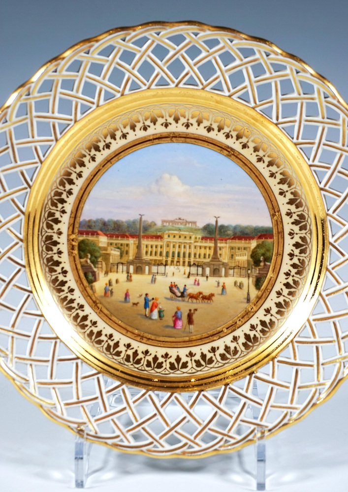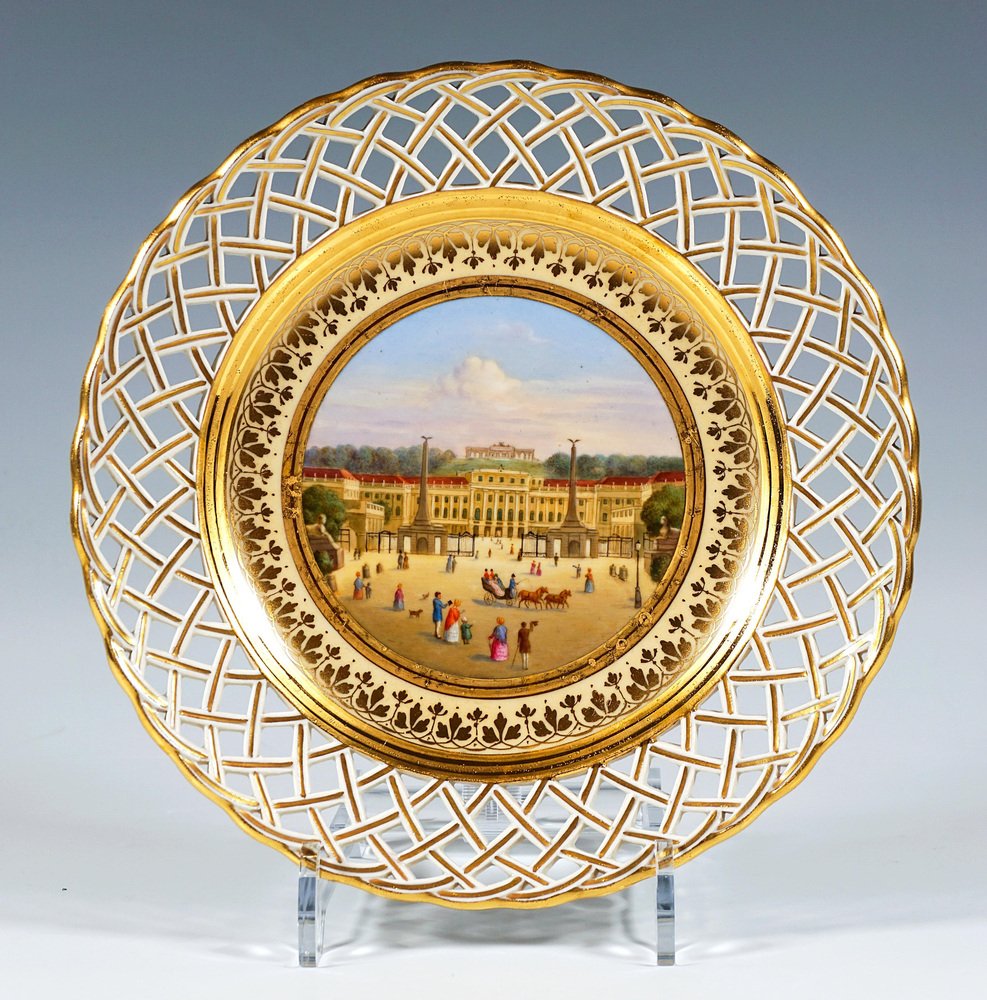 Porcelain picture plate with a finely painted polychrome veduta: In the mirror view of the Viennese summer palace Schönbrunn with the Gloriette on the hill in the background, seen from the main entrance, with figures. The baroque palace was the summer residence of the kings and emperors of the empire from the mid-18th century until the end of the Holy Roman Empire in 1806 and from 1804 until the end of the First World War of the Austrian imperial family. During this time, the palace was almost continuously inhabited by a royal household comprising several hundred people and became a cultural and political centre of the Habsburg Empire. During the Austro-Hungarian monarchy, it was also known as the k. k. Lustschloss Schönbrunn (Imperial and Royal Summer Palace of Schönbrunn). The wall has a basket-weave openwork flag highlighted in gold and a gold edge. Inscription in gold on the reverse: ‘K.k. Lustschloß Schönbrunn à Viènne’. Manufactory: 'Alt Wien' Old Imperial Austrian Porcelain Manufactory Vienna Date of manufacture: 1818 Technique: white handmade porcelain, painted, glossy finish, gold staffage Size: diameter: 24,5 cm / 9.64 in height: 3,5 cm / 1.37 in Marks: Underglaze blue shield from the Imperial Manufactory Vienna Year's mark '818' for the the year of origin 1818 Incised 'B' - modeller Leopold Danhauser Former's number 51 Condition: very good overall condition, item over 200 years old