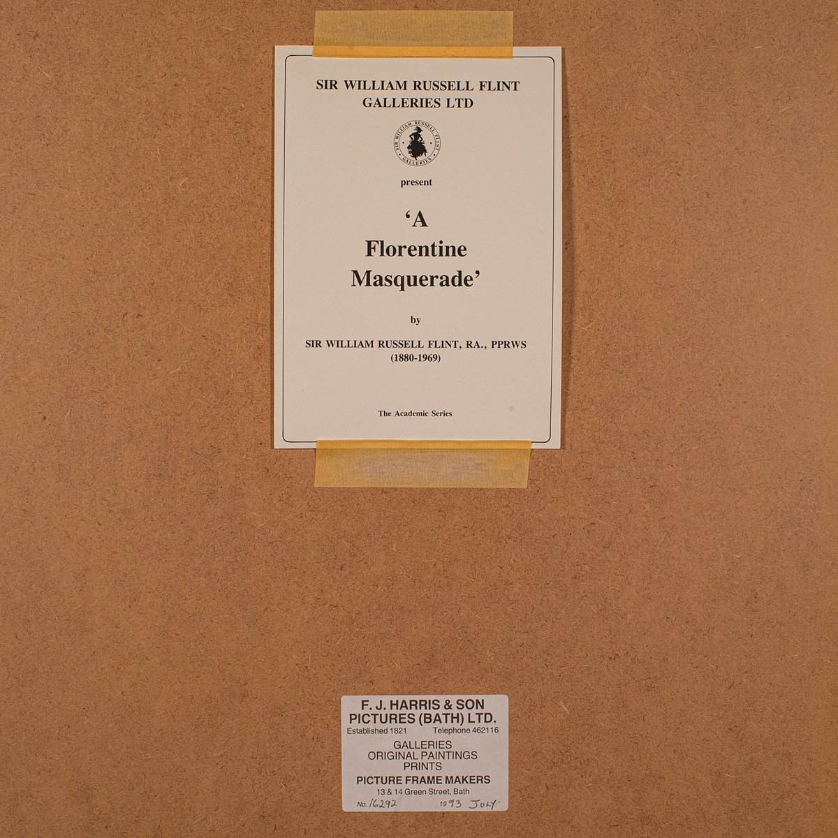 This is a large vintage limited edition art print. An English, framed painting titled 'Florentine Masquerade' by Sir William Russell Flint, dating to the late 20th century, circa 1990.
