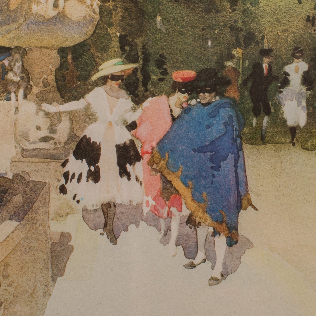 Dies ist ein großer Vintage-Kunstdruck in limitierter Auflage. Ein englisches, gerahmtes Gemälde mit dem Titel "Florentine Masquerade" von Sir William Russell Flint, aus dem späten 20. Jahrhundert, um 1990.
