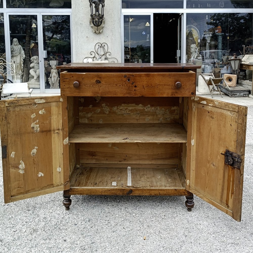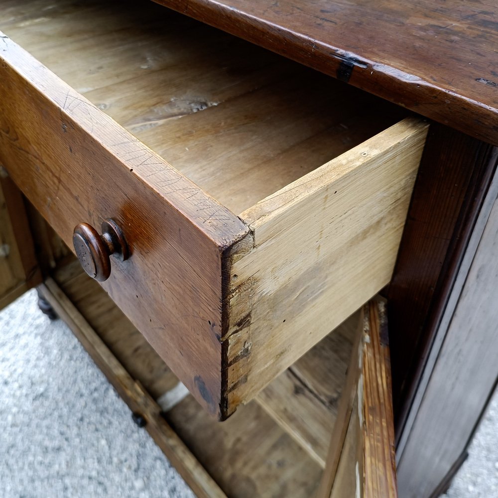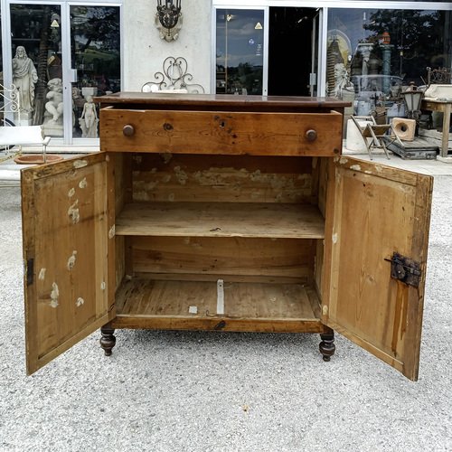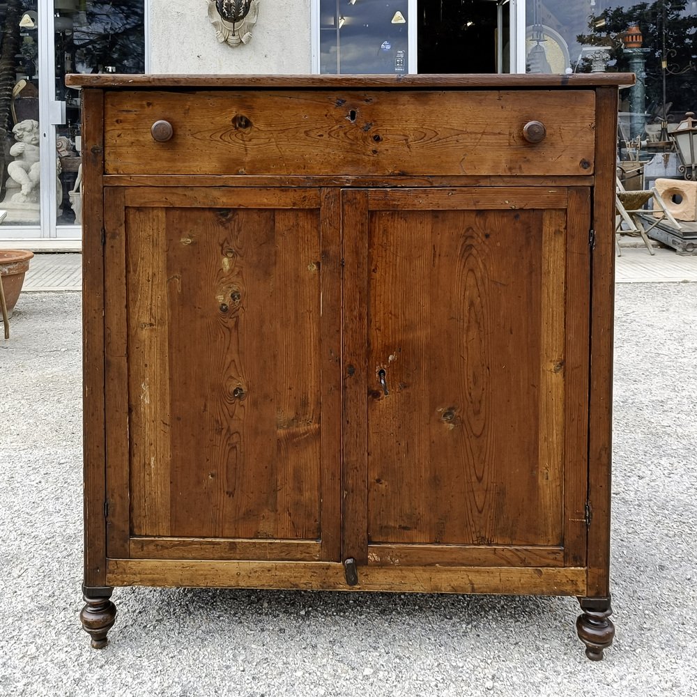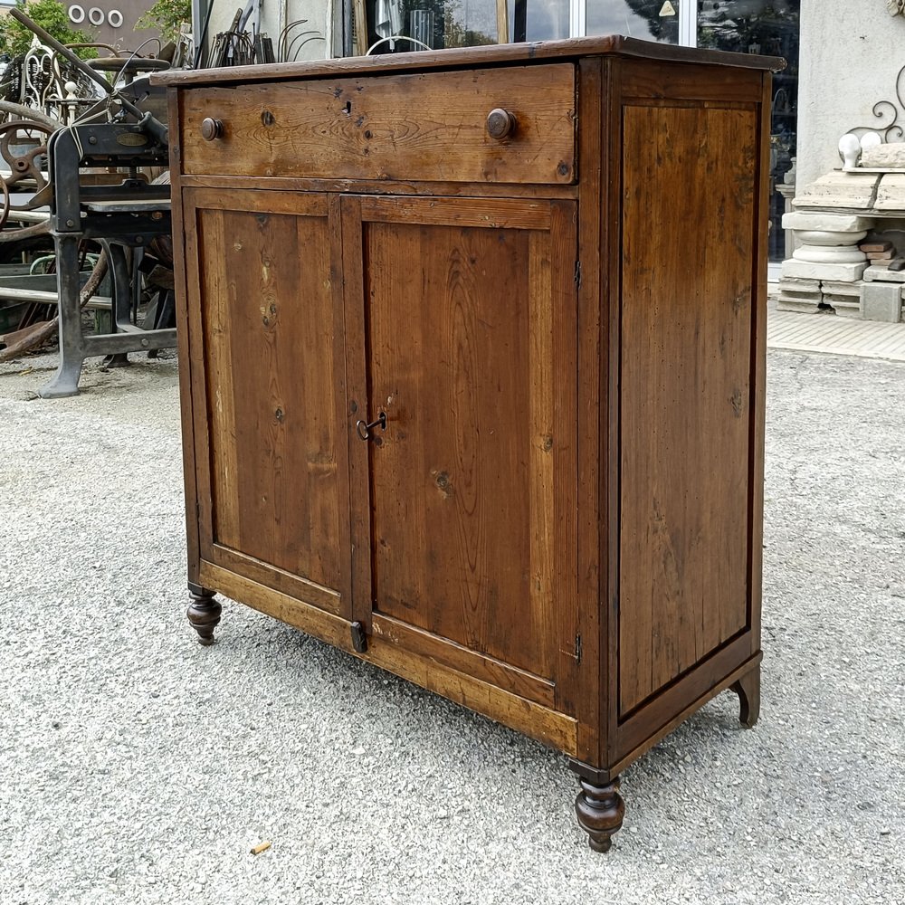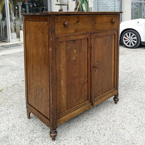 Rustic two-door kitchen sideboard made of solid fir from the 1800s with a large drawer with dovetail structure, turned foot, framed side. The lock is original from the time. Measurements 108 x 51 x h 114.Dimensions: Height 114 cm Width 108 cm Depth 51 cm Color: brown Material: wood, metal Conditions: Good vintage item, fully functional but shows signs of wear such as scratches, dents, material defects and repairs.