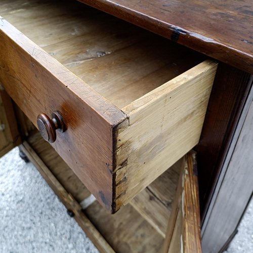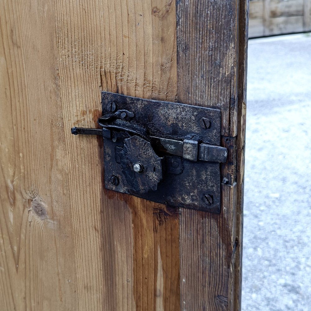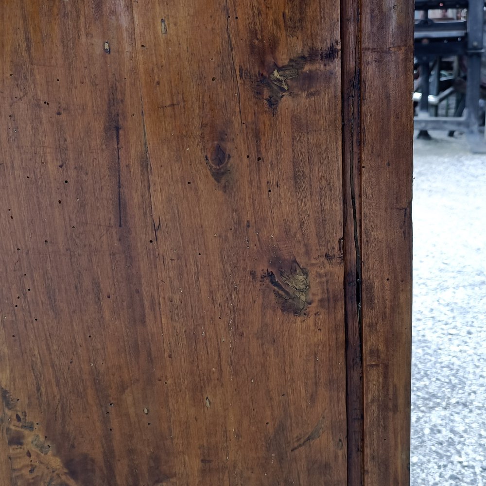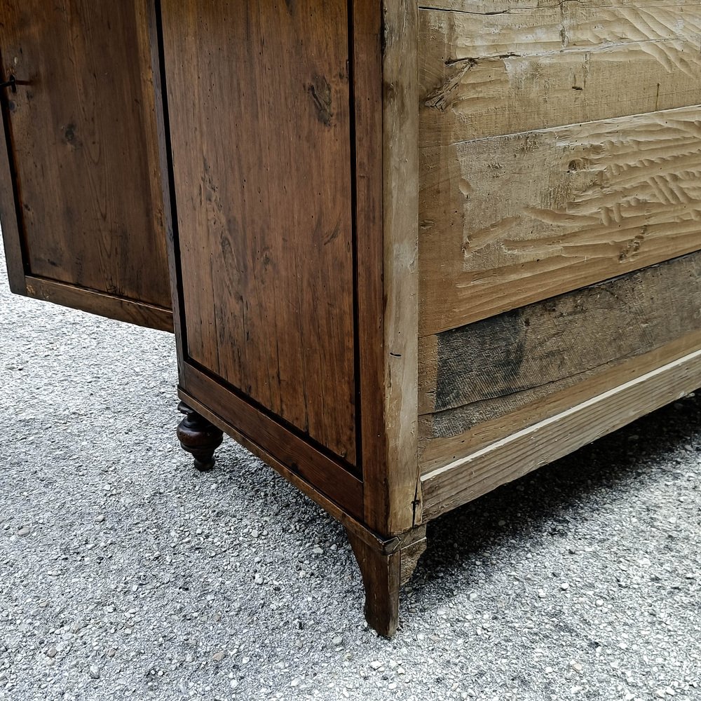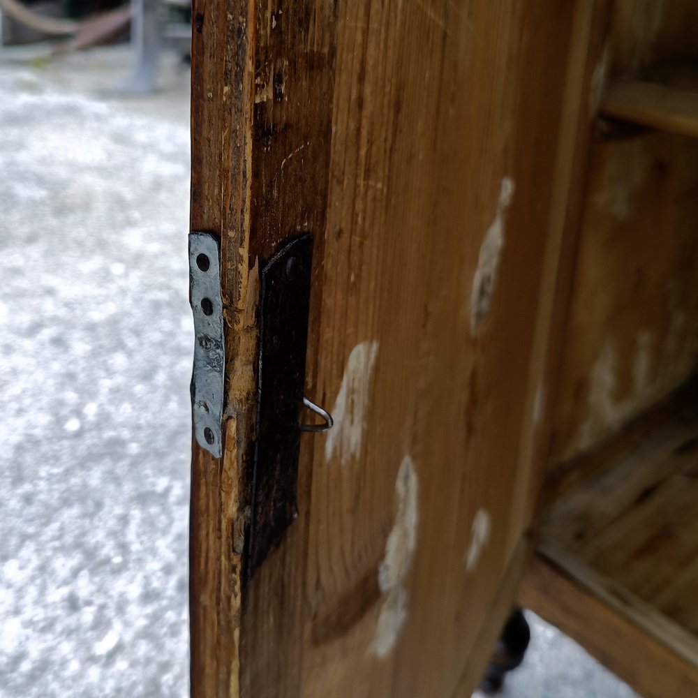 Rustikale zweitürige Küchenanrichte aus massiver Tanne aus der Zeit um 1800 mit einer großen Schublade mit Schwalbenschwanzstruktur, gedrechseltem Fuß, gerahmter Seite. Das Schloss ist original aus der Zeit. Maße 108 x 51 x H 114.Abmessungen: Höhe 114 cm Breite 108 cm Tiefe 51 cm Farbe: braun Material: Holz, Metall Zustand: Guter Vintage-Artikel, voll funktionsfähig, weist aber Gebrauchsspuren wie Kratzer, Dellen, Materialfehler und Reparaturen auf.